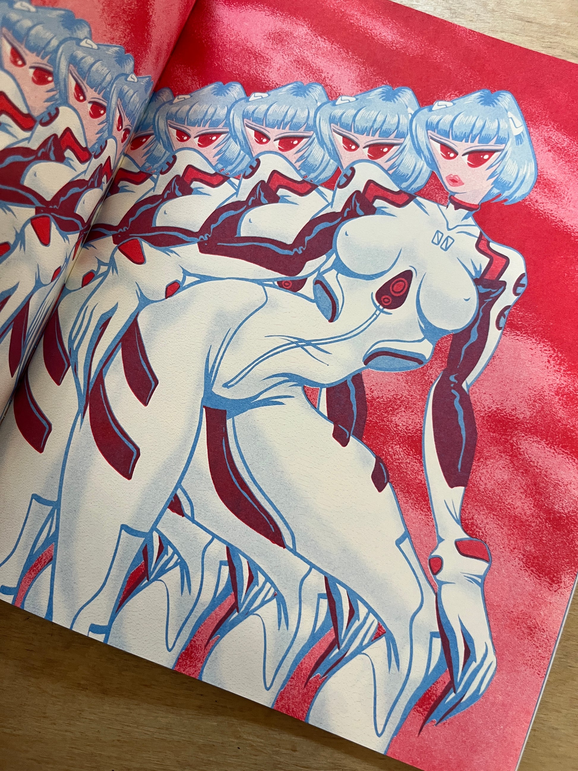 Risograph zine. Interior printed with Cornflower & Bright Red. Cover printed with Aqua, Fluorescent Pink, Light Lime, & Black.