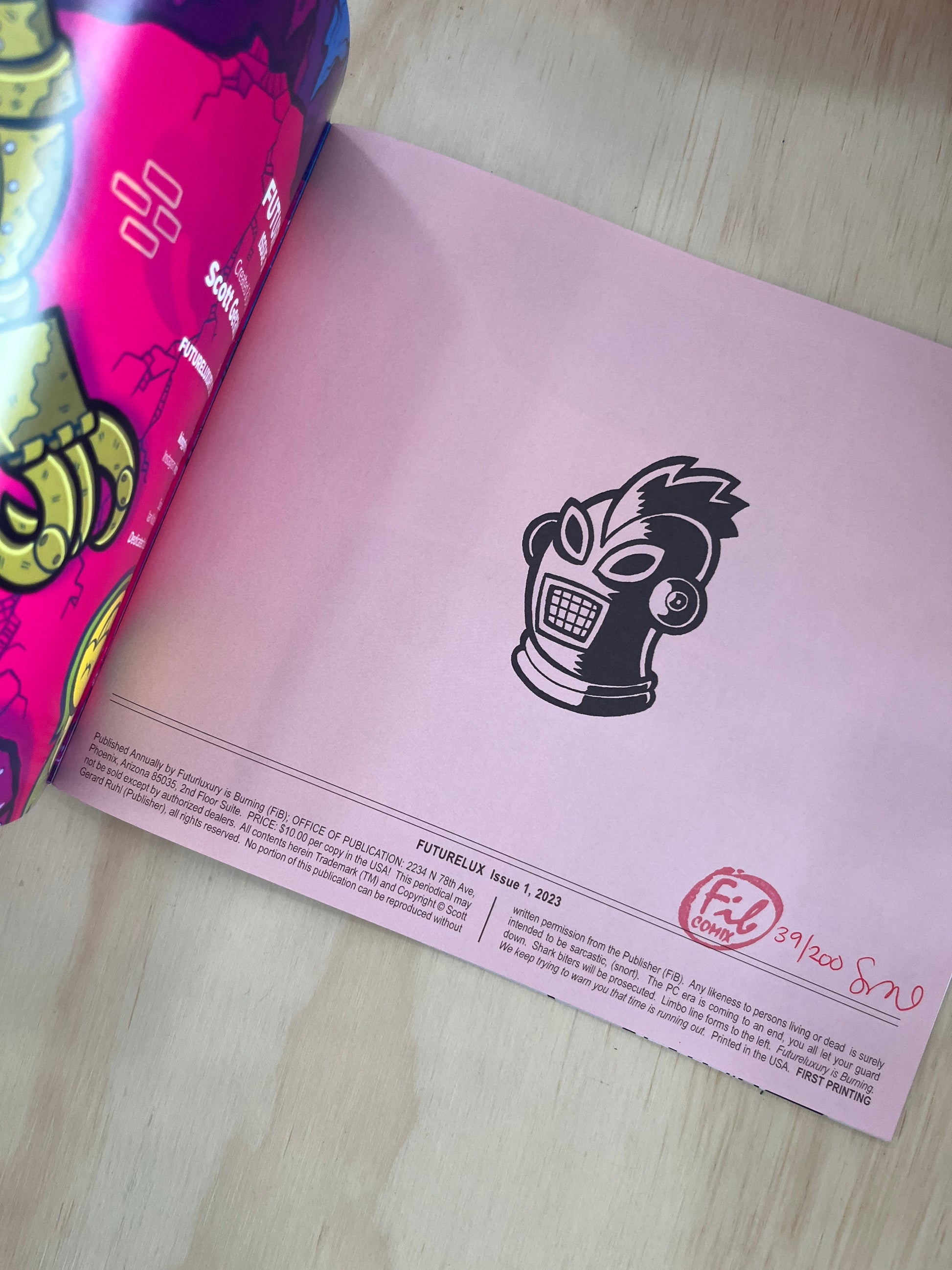28 pages with cardstock cover, first printing signed & numbered, limited to 200 copies. Adults only please. For kids 16+. Printed in the USA.