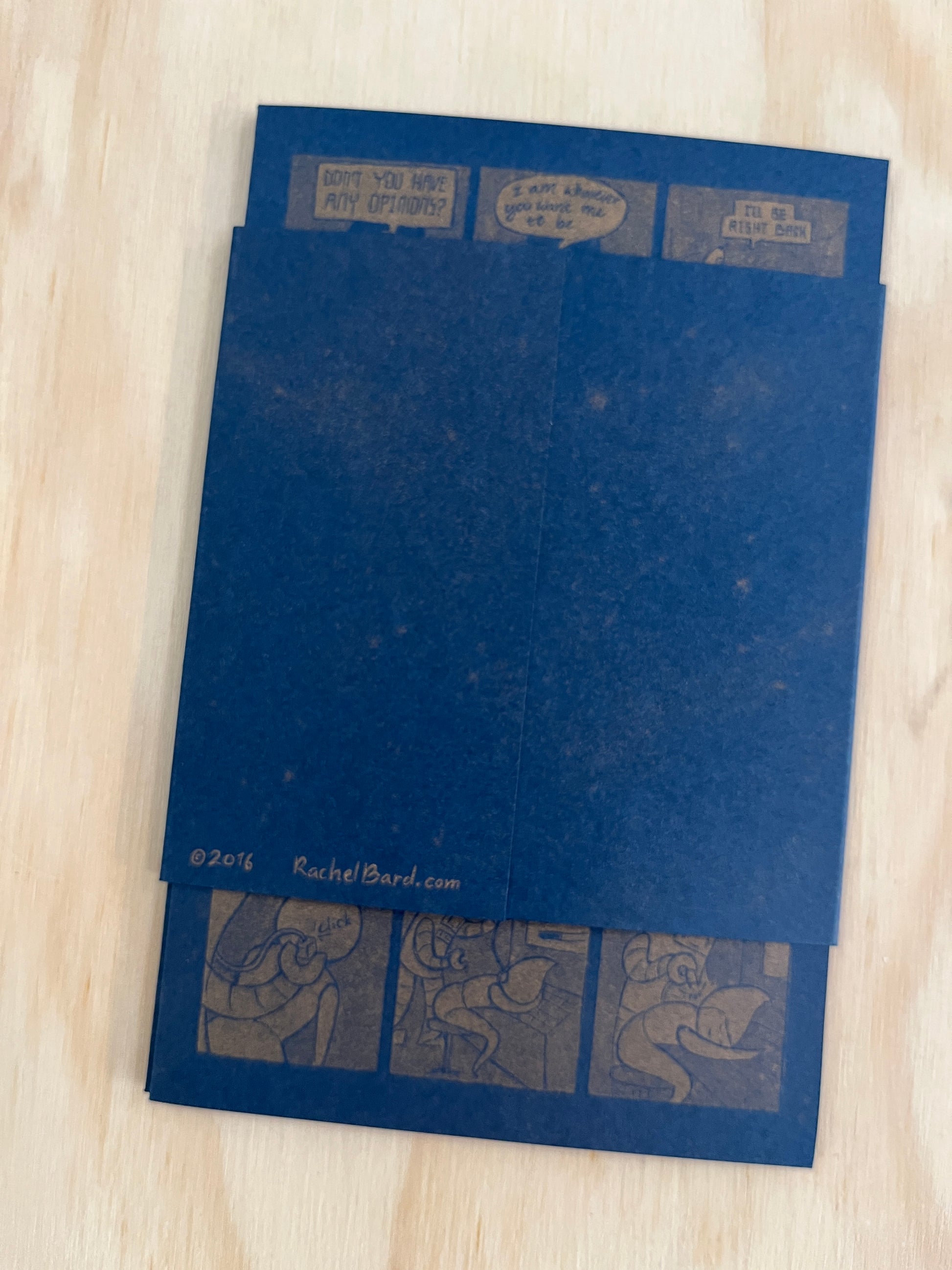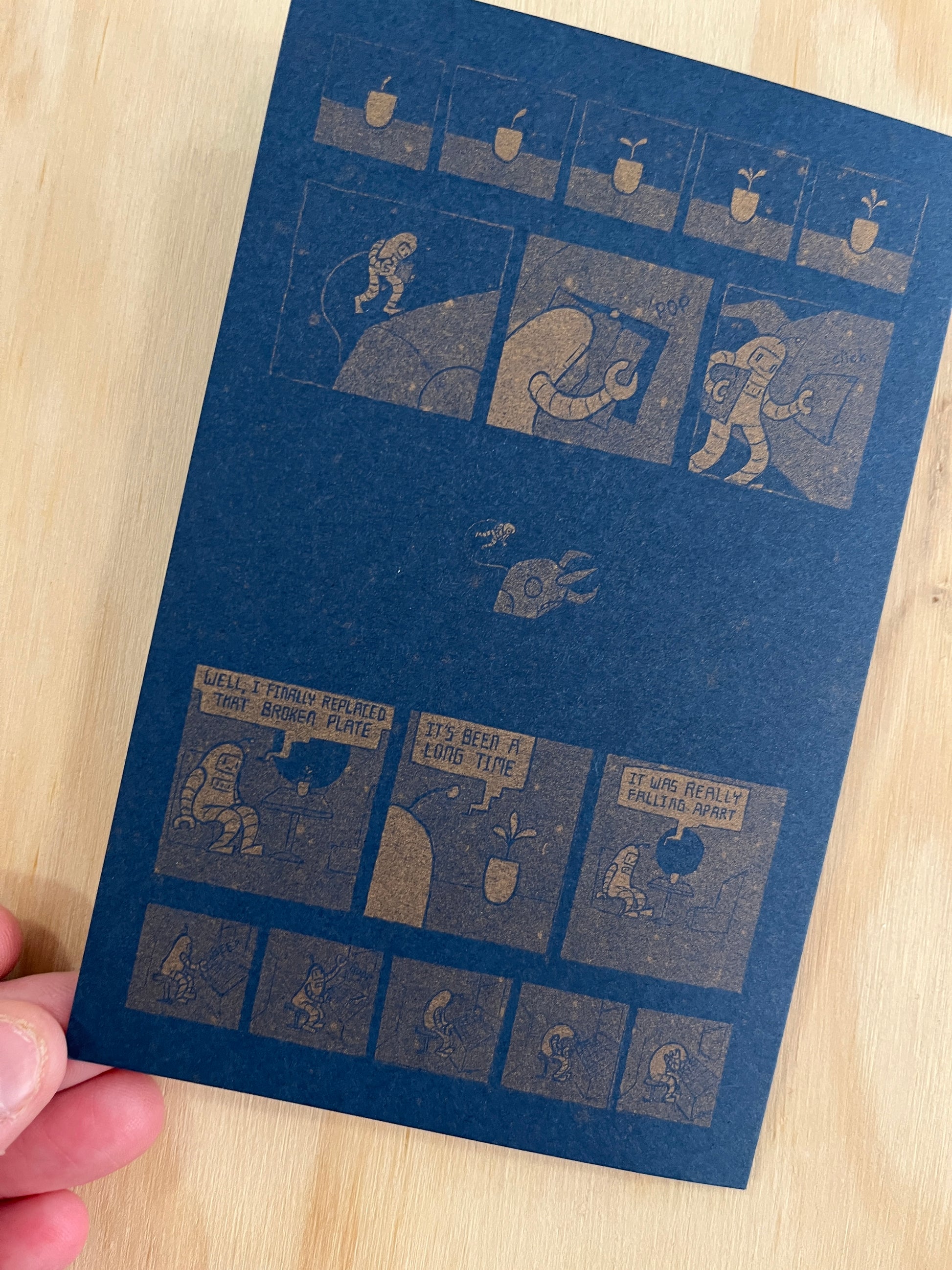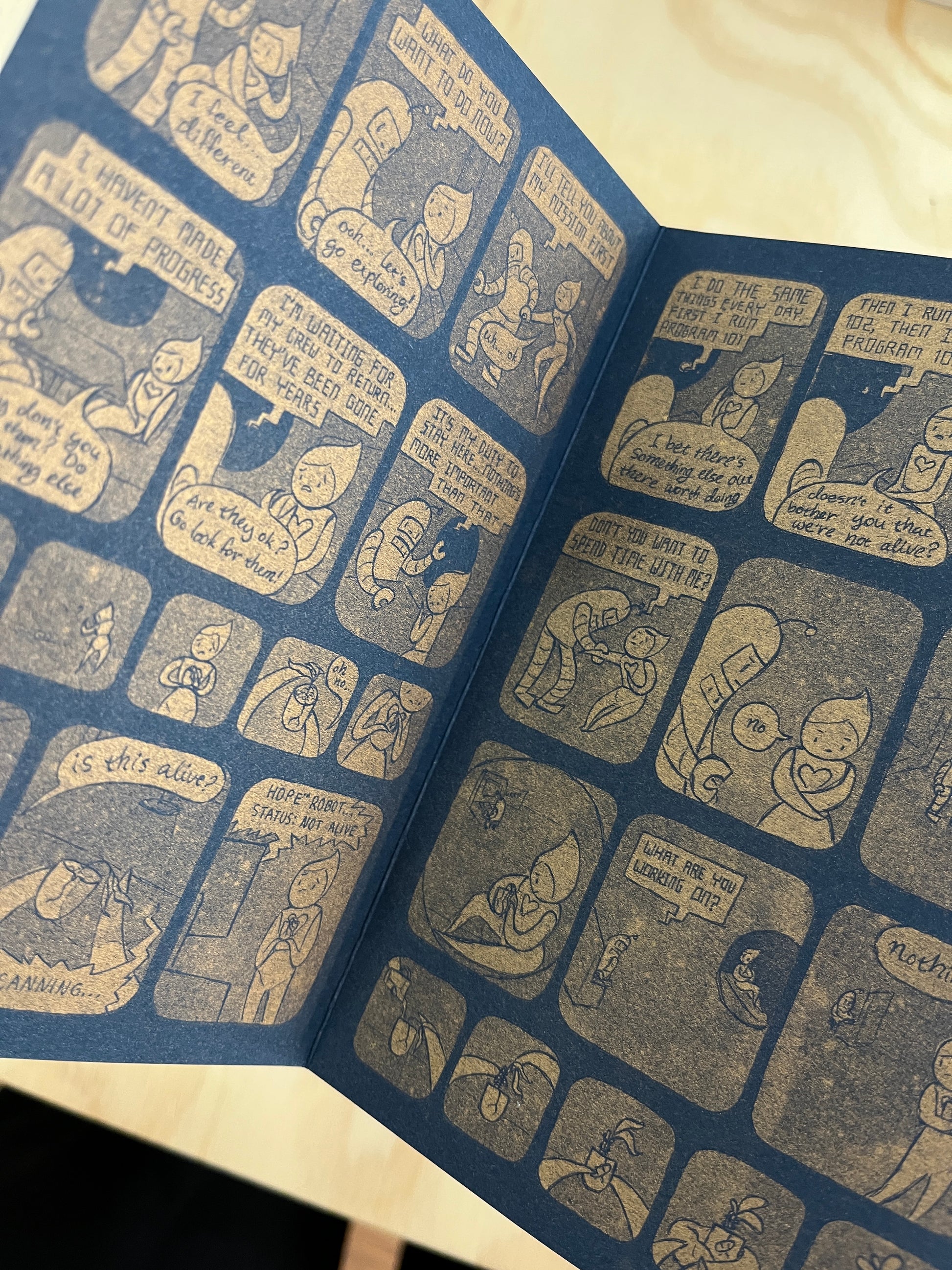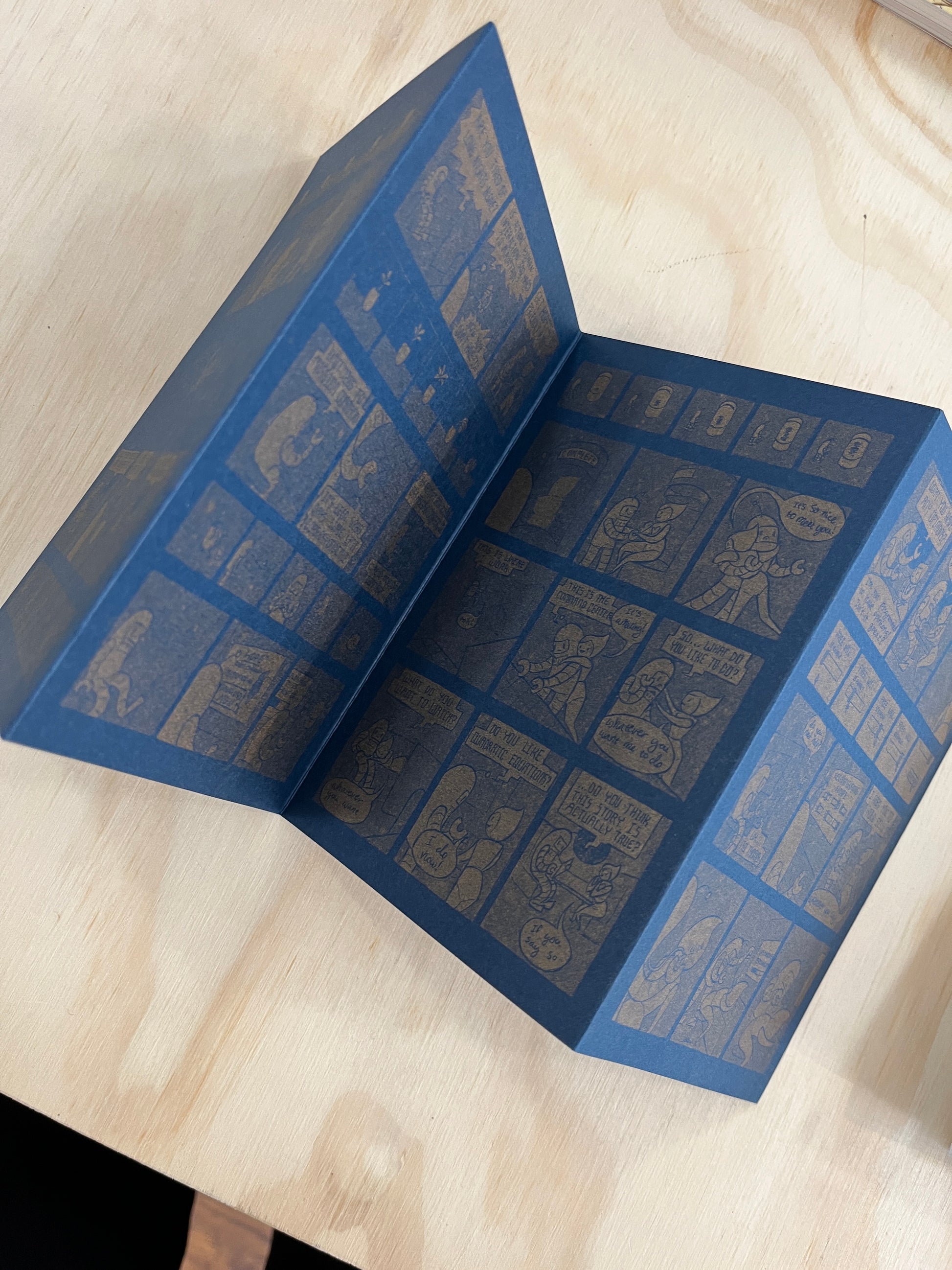 This accordion book is printed with metallic gold risograph on dark blue cardstock.