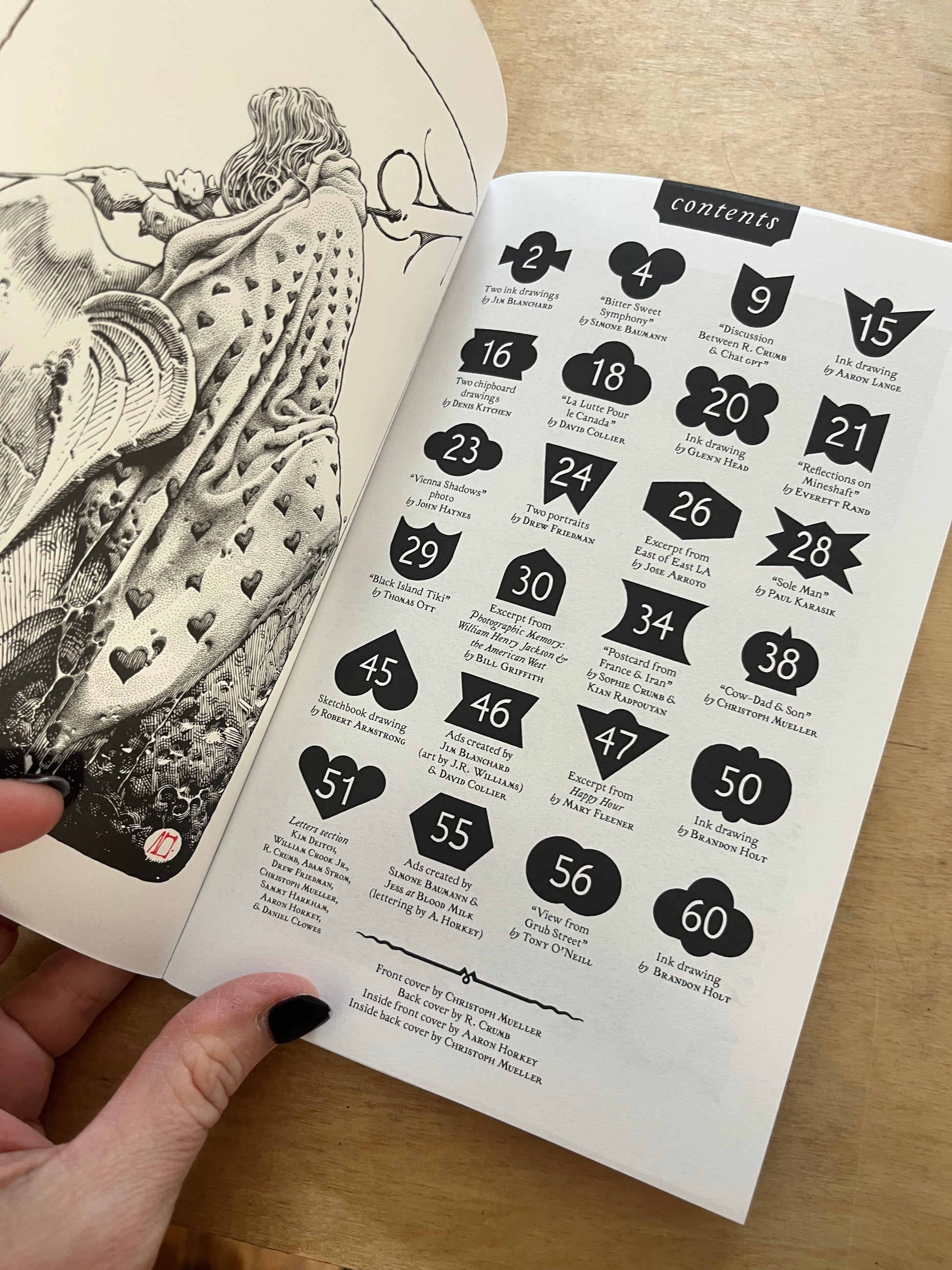Mineshaft #47 is HERE!!! Featuring dynamite front cover art by Christoph Mueller, with beautiful back cover art by R. Crumb! Plus... new work by R. Crumb "Discussion with Chat GPT", Christoph Mueller, Jim Blanchard, Drew Friedman, Aaron Horkey (inside front cover), Brandon Holt, Simone Baumann, Denis Kitchen, David Collier, Glenn Head, Thomas Ott, Jose Arroyo, Bill Griffith, Mary Fleener, Sophie Crumb & Kian Radpouyan, Paul Karasik, Robert Armstrong, Tony O'Neill, Letters from Around the World (including Daniel Clowes, R. Crumb, Kim Deitch, William Crook, Aaron Horkey, Sammy Harkham, Drew Friedman, Christoph Mueller), & MORE!!! First printing. 60 pages. 1,200 copies printed on offset Press, with sewn binding, in Denmark in November/December, 2025. Cover printed on Swedish Munken Polar Rough 300 gram Cover paper with Munken Lynx Rough interior pages.