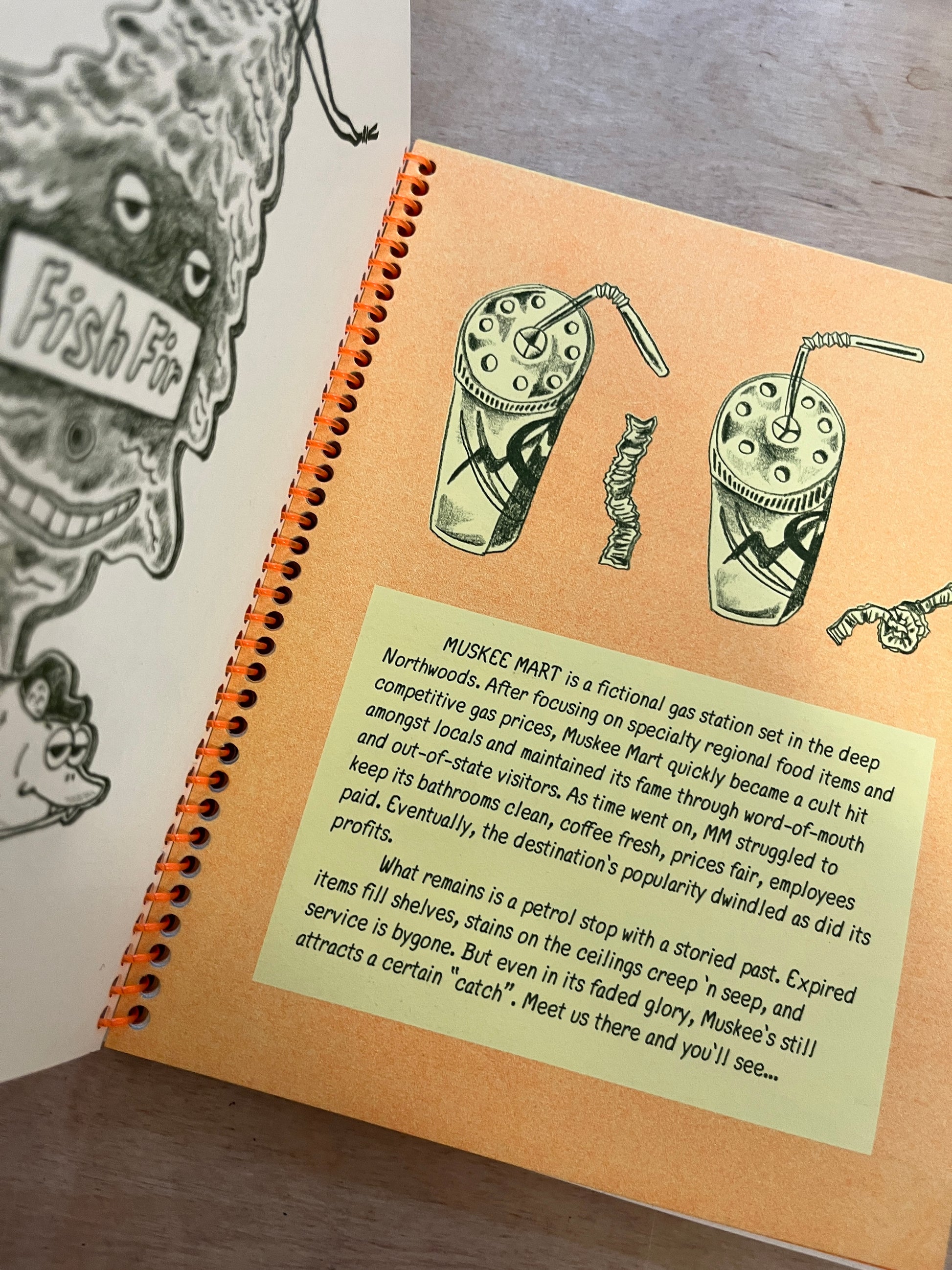 Muskee Mart is a fictional gas station set in the deep Northwoods. After focusing on specialty regional food items and competitive gas prices, Muskee Mart quickly became a cult hit amongst locals and maintained its fame through word-of-mouth and out-of-state visitors. As time went on, M.M. struggled to keep its bathrooms clean, coffee fresh, prices fair, employees paid. Eventually, the destination's popularity dwindled as did its profits. Expired items fill shelves, stains on the ceilings creep 'n seep, and service is bygone What remains is a petrol stop with a storied past. But even in its faded glory, Muskee's still attracts a certain "catch". Meet us there and you'll see...