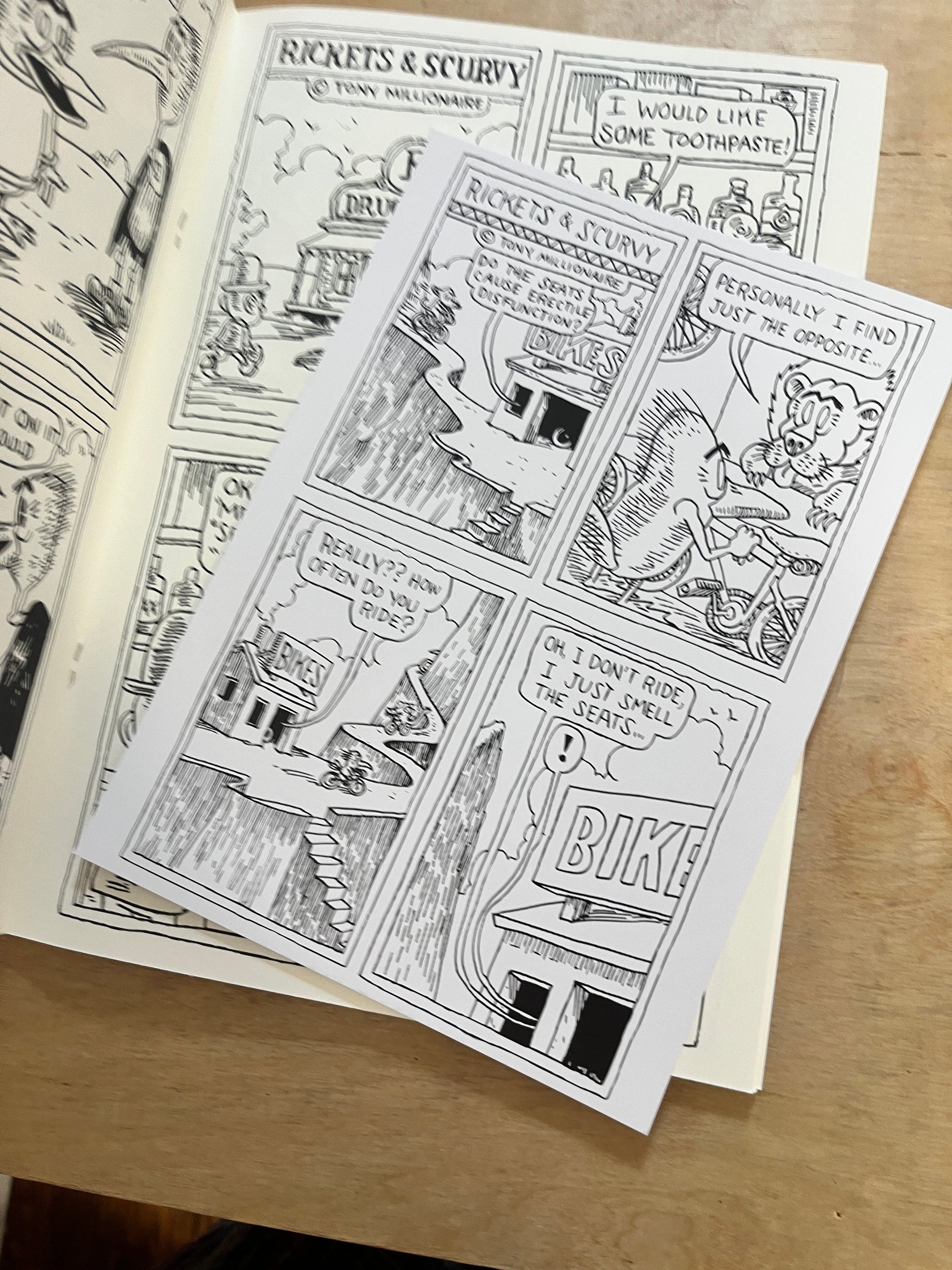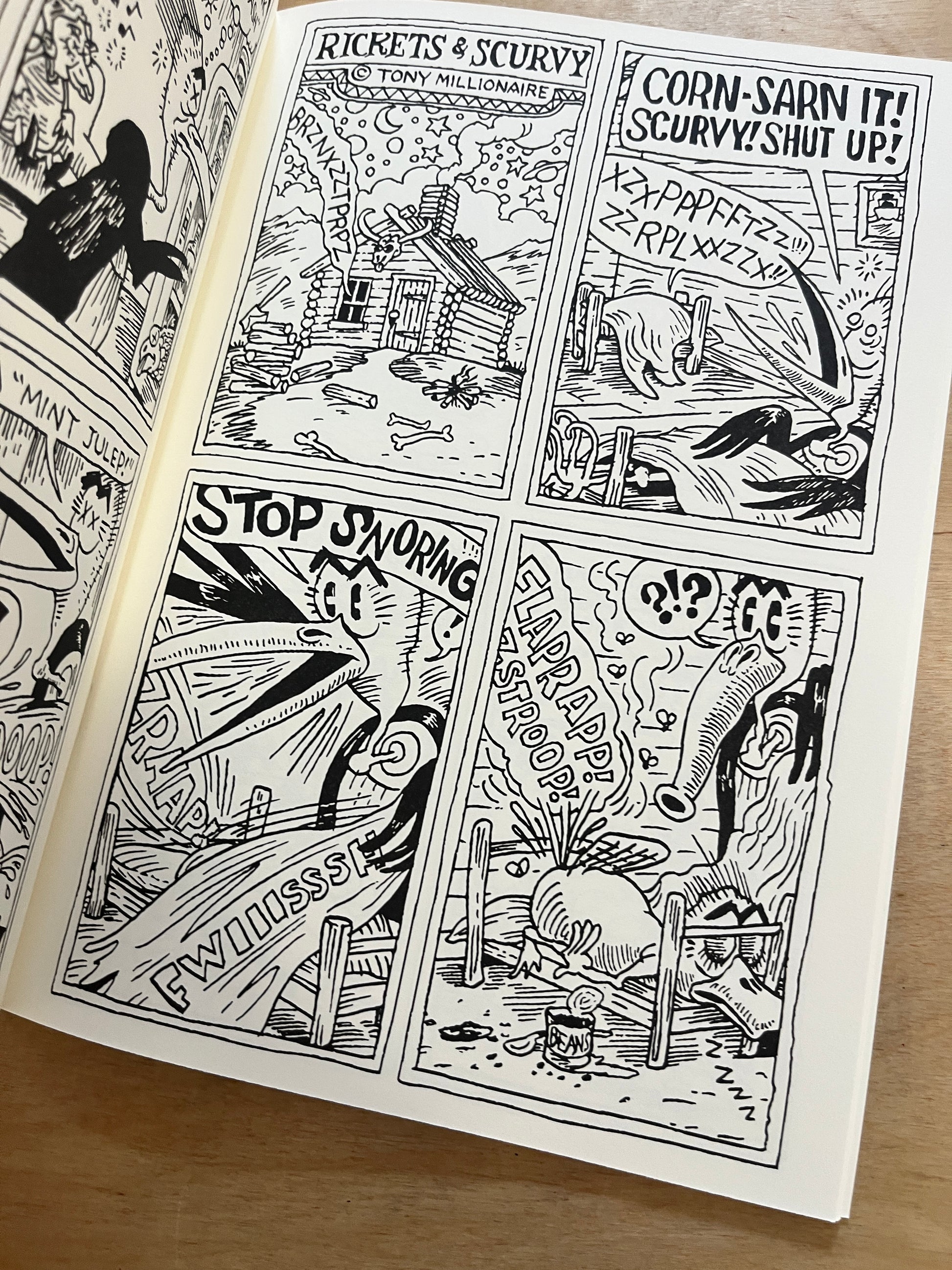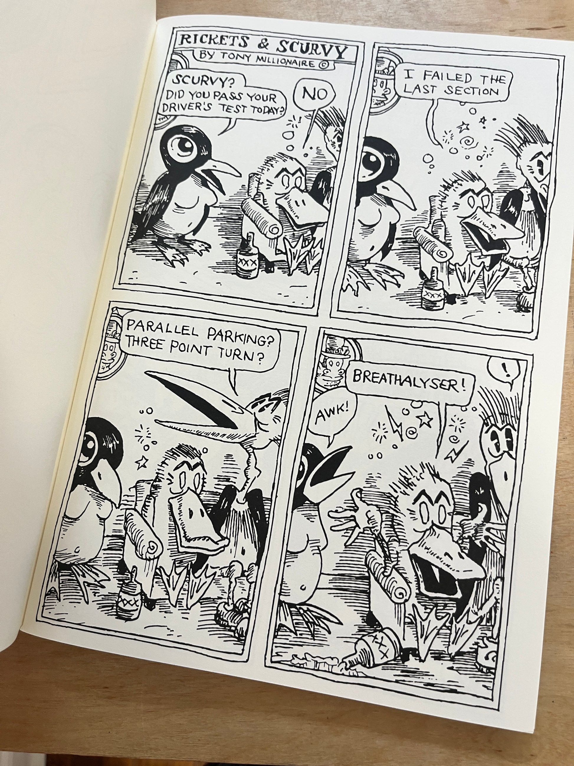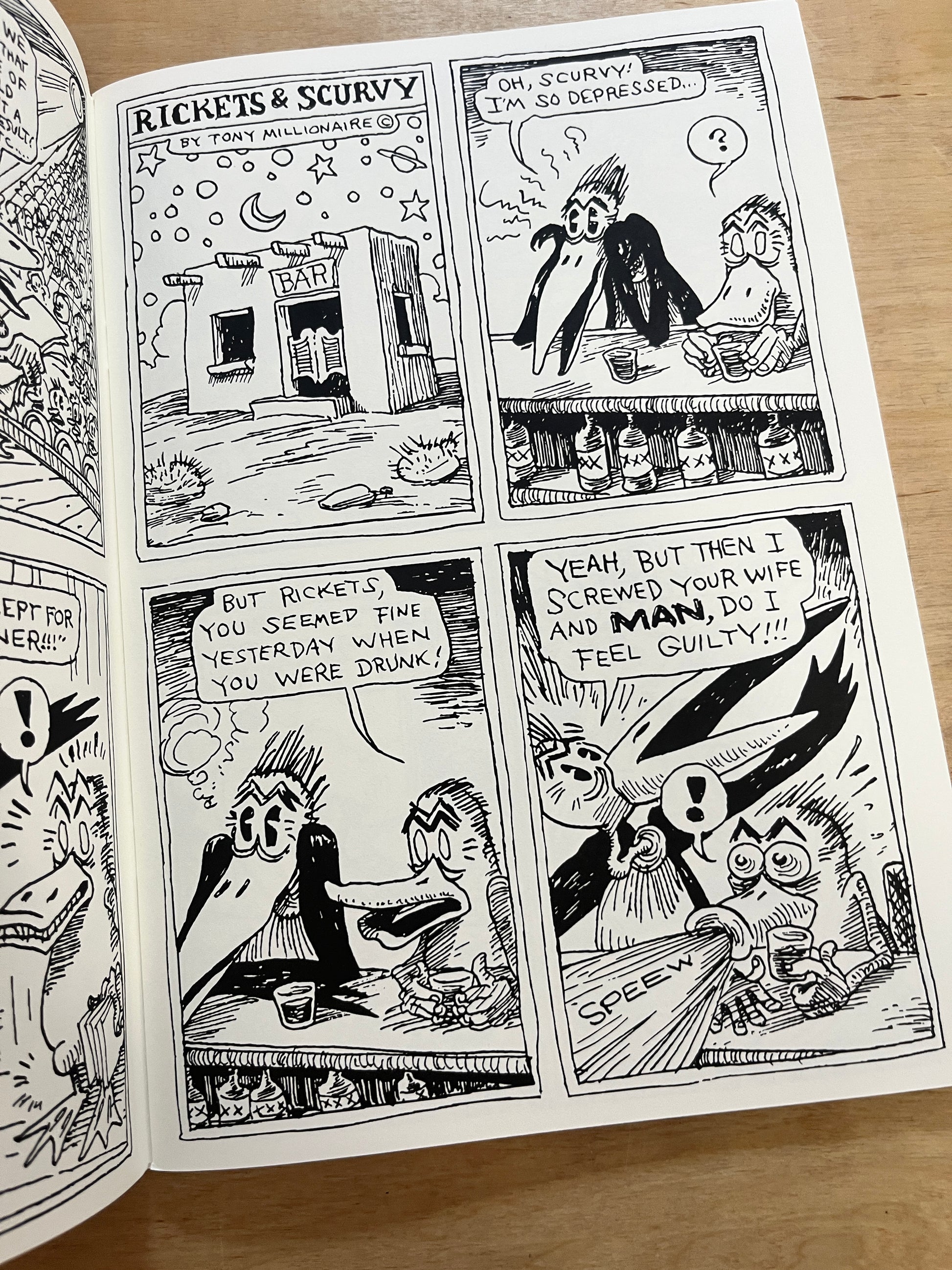 Forget Drinky Crow. You won’t find him here. Instead, discover a deliriously funny and unapologetically absurd collection of comic strips featuring Rickets and Scurvy, two hopelessly idiotic characters adrift in a universe without logic, structure, or purpose. Every page overflows with chaotic humor, dark poetry, and the fearless spirit that has made Tony Millionaire a legend of underground comics.