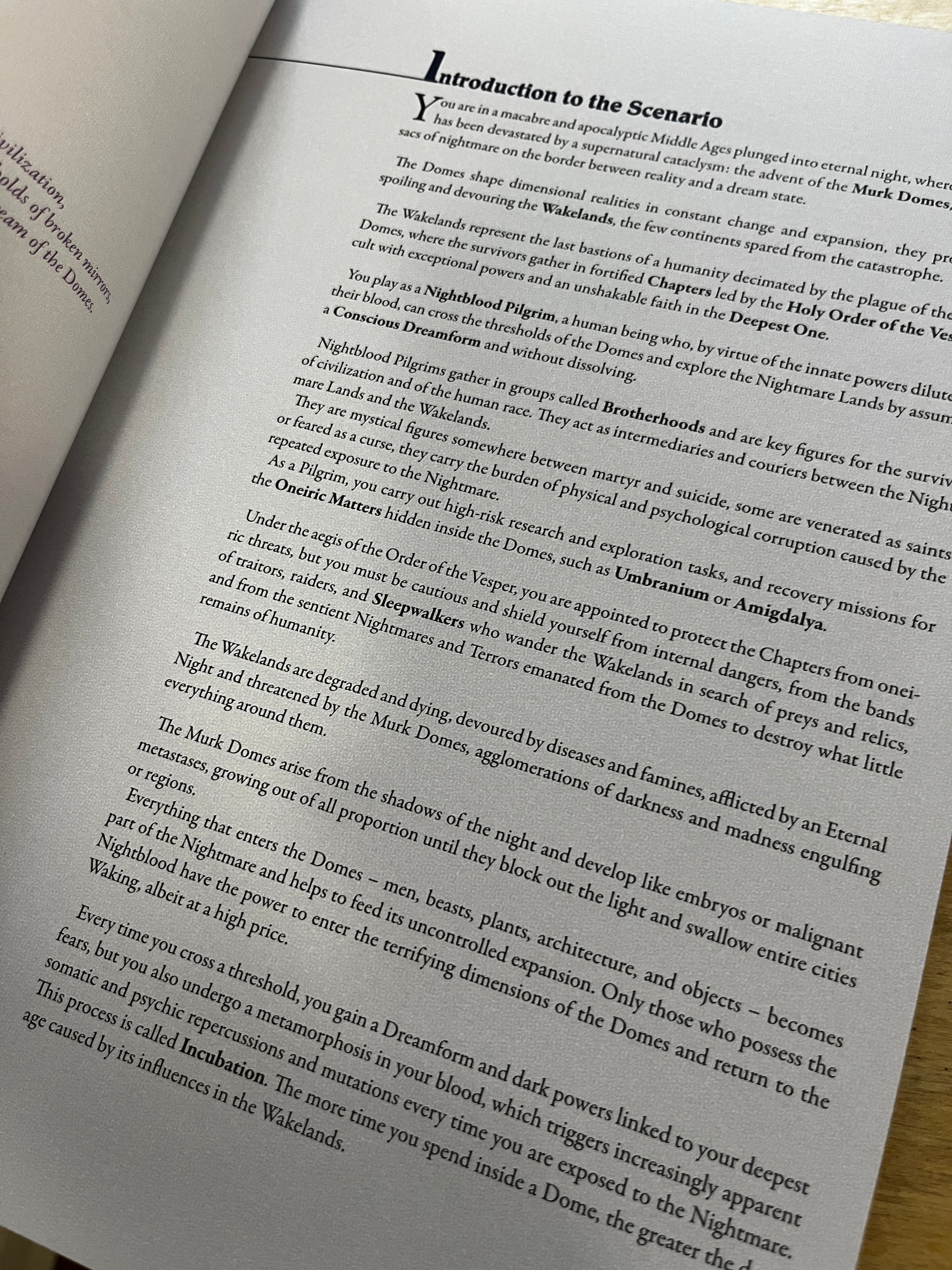 Pilgrims of the Murk Dome is a dark fantasy, fiction-first RPG set in a macabre and apocalyptic Middle Ages, where the world has been devastated by a supernatural cataclysm known as the coming of the Murk Domes, pulsating pockets of nightmare that serve as portals to the horrors of the dream world.